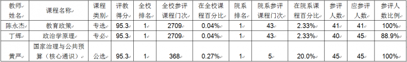 日前,据中山大学教务部反馈的2016学年第一学期本科课程学生网上评教结果,我院本科教学取得喜人成绩。陈永杰、丁辉、王清、郑跃平、黄冬娅、黄严等老师任教的共7门课程处于全校评教结果20%以内。其中,陈永杰老师任教的《教育政策》、丁辉老师任教的《政治学原理》在全校开设的2709门课程中取得并列第一名,黄严老师任教的《国家治理与公共预算》课程在全校开设的368门公共选修课中取得第一名。祝贺上述老师取得的喜人成绩,学院也将继续加大本科教学改革和投入的力度,使教学质量得到进一步提高。