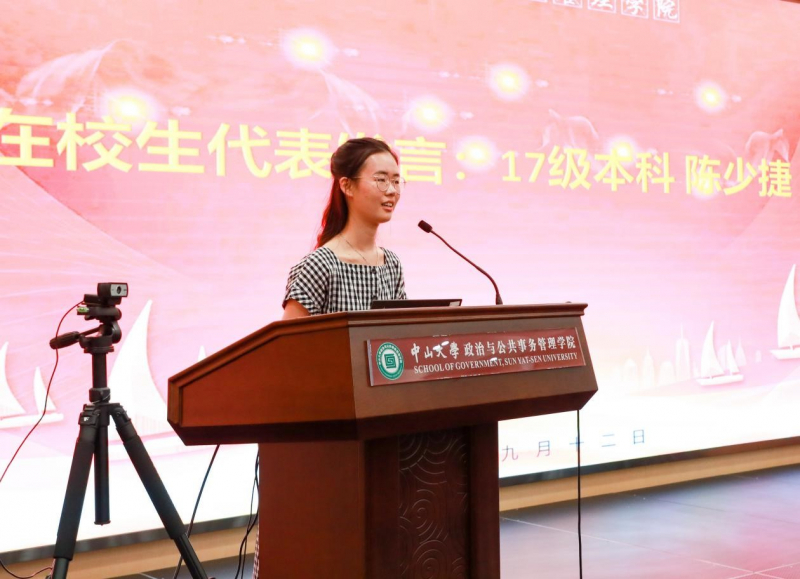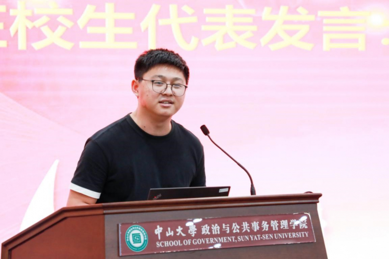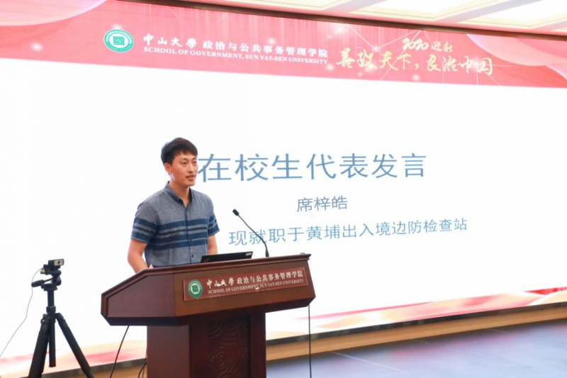 MPA在校代生代表2019级席梓皓同学分享了自己来到中山大学政务学院学习的感受,鼓舞同学们充分利用好中山大学丰富的学习资源,不负学校对大家“德才兼备、领袖气质、家国情怀”的期许,激励大家扛起责任,奋发图强,矢志不渝,在“善政天下,良治中国”的征途上奋勇前行。