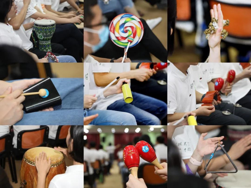 下午,踩着激扬澎湃的鼓点,学员们共同走进鼓圈,在引导老师的带领下用音乐互相鼓励打气,默契配合。刹那间,学员们仿佛去到了非洲的原始森林。跟着原始又昂扬的节拍,大家似乎都褪去了工作中的疲乏,忘记了自己形色不同的社会身份,回到了青葱岁月,回到了最美好的校园生活。