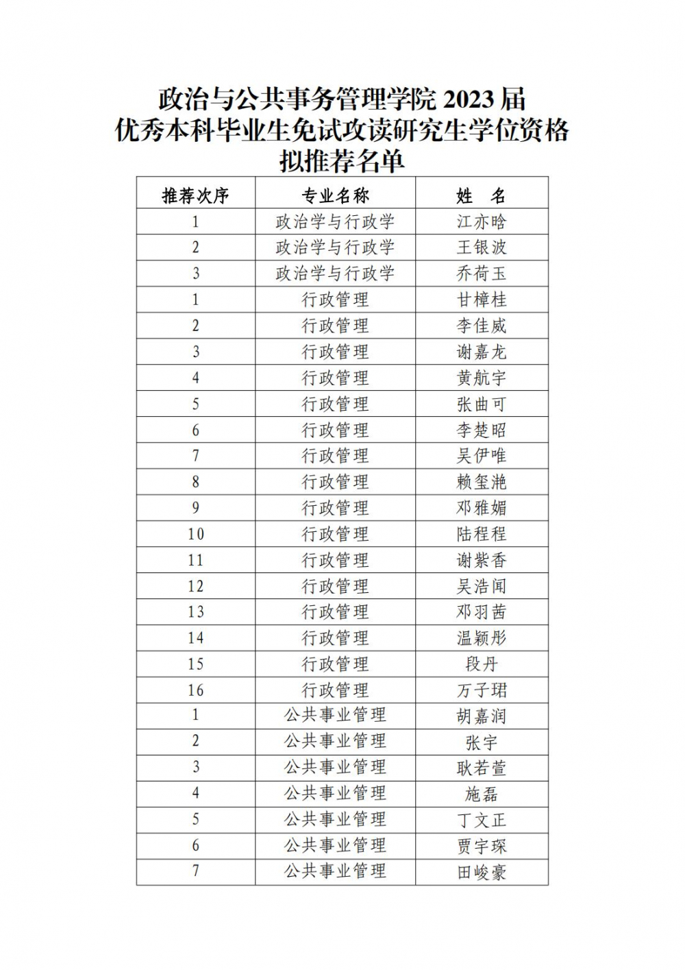 关于公示政治与公共事务管理学院2023届优秀本科毕业生免试攻读研究生学位资格拟推荐名单的通知