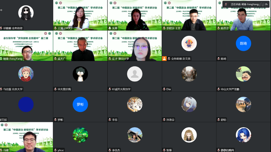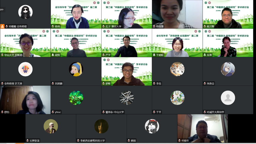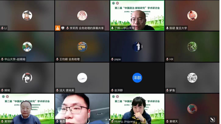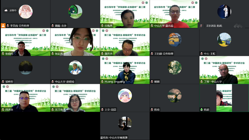 2022年12月3日,由中山大学政治与公共事务管理学院、中山大学当代中国政治研究中心、中山大学廉政与治理研究中心共同主办的第二届“中国政治· 新锐研究”学术研讨会成功举办。会议全程通过线上方式进行,来自北京大学、清华大学、复旦大学、中国人民大学、中国社会科学院、南京大学、浙江大学、上海交通大学、香港大学、香港科技大学、香港中文大学(深圳)、广东外语外贸大学、华东政法大学、华中师范大学和我校的众多学者分享了最新研究成果,对中国政治学发展的核心与前沿问题进行了深入探讨。