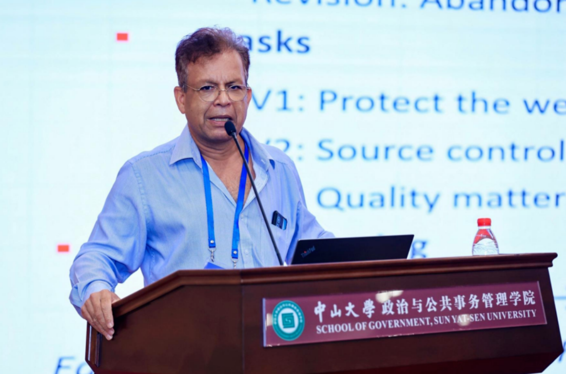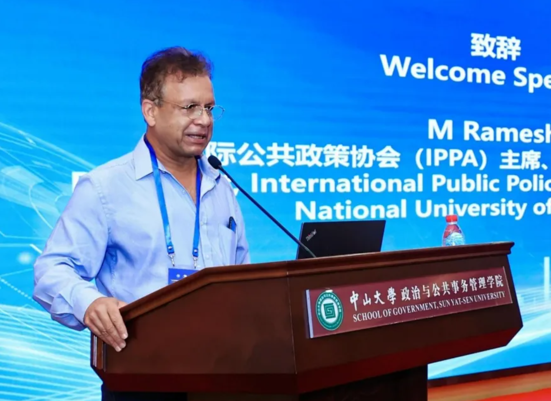 国际公共政策协会(IPPA)前主席、新加坡国立大学M. Ramesh教授致辞。他强调公共政策学界的国际合作重要性,近年来中国学者在国际公共政策学界的活跃度大大提升,他期待能增加更多与中国学者合作机会,鼓励更多年轻中国学者投入到国际公共政策研究交流中。