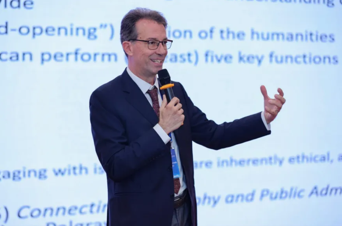 Public Policy and Administration主编、英国开放大学Edoardo Eriprando Ongaro教授发表了题为“The Contribution of the Humanities to the Advancement of Public Governance and Public Administration”的主旨演讲。Ongaro教授讨论了人文学科对公共行政的意义,希望整合哲学、艺术、历史等人文学科视角,深化对公共治理的理解。Ongaro教授指出,人文学科具有启迪功能(照亮本质问题)、批判功能(质疑既定框架)、补缺功能(填补社科研究盲点)、整合功能(连接碎片化知识)和规范功能(关注伦理、权利);在多危机时代(poly-crisis)和新技术、新观念相交织的当代,人文学科的意义更不可或缺。